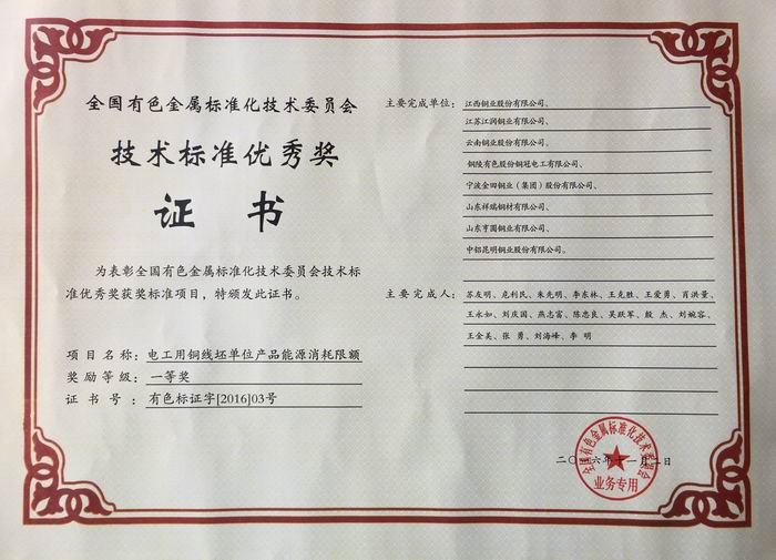 與此同時,我公司獲得由全國有色金屬標準化技術(shù)委員會頒發(fā)的“技術(shù)標準優(yōu)秀獎(一等獎)”。